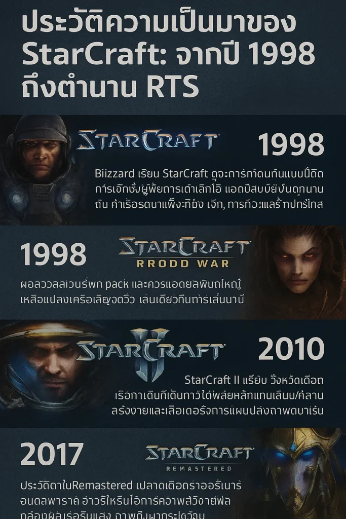 StarCraft ไม่ได้เป็นเพียงเกม RTS แต่คือ ตำนานแห่งยุคดิจิทัล ตั้งแต่ปี 1998 จนถึงปัจจุบัน มันสร้างชุมชนผู้เล่นที่แข็งแกร่ง จุดกำเนิด Esports ระดับโลก และยังคงเป็นแรงบันดาลใจไม่เสื่อมคลาย